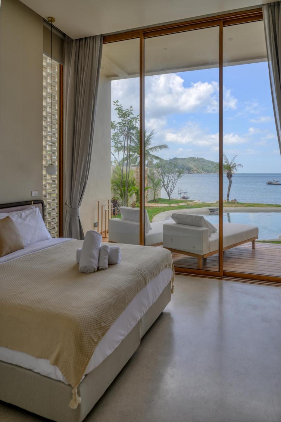 Three-Bedroom Villa. This villas special features are the pool with a view and the hot tub. Boasting a private entrance, this spacious villa also includes 3 bedrooms, a seating area and 3 bathrooms with a walk-in shower and a bath. Guests can make meals in the kitchen that has a stovetop, a refrigerator, a dishwasher and kitchenware. The air-conditioned villa offers a flat-screen TV with streaming services, soundproof walls, a minibar, a tea and coffee maker as well as sea views. The unit has 4 beds.