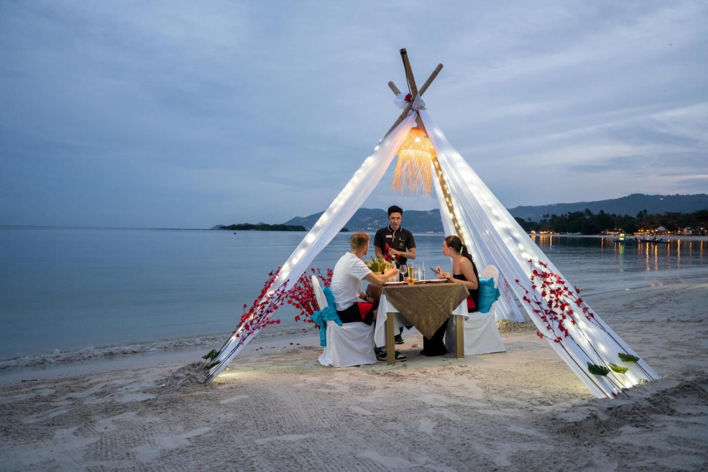Dreamy sunset views are enjoyed with cocktails and refreshing beverages at the Beach Bar. The restaurant serves a delicious selection of Asian and Western dishes, and room service is also available. Guests can sign up for Thai cooking classes.