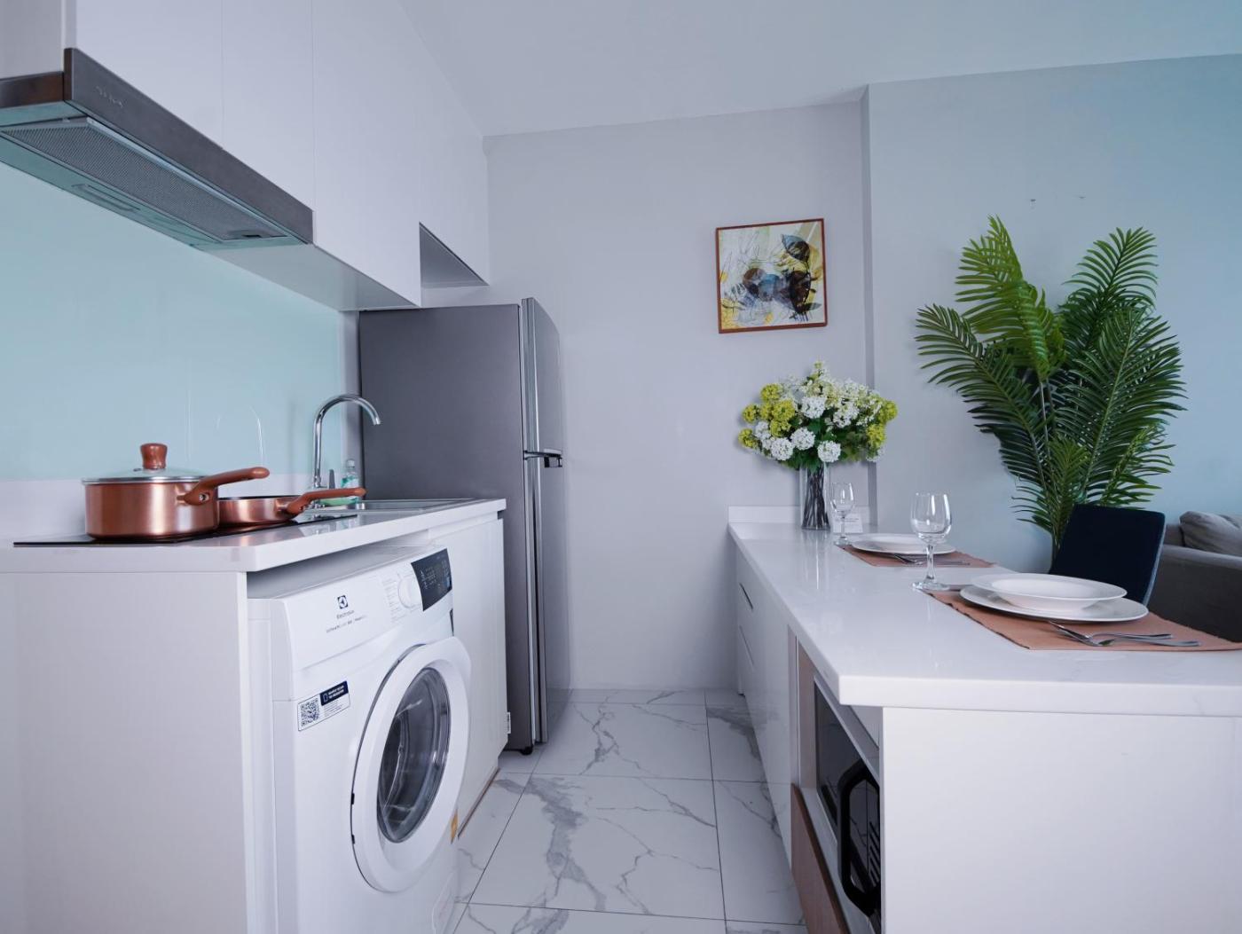 The apartment comes with 1 bedroom, a fully equipped kitchen with a microwave and a toaster, a washing machine, and 1 bathroom with slippers and a hair dryer. A flat-screen TV is featured.